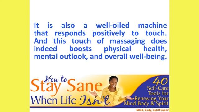 http://staysanenow.com/blog -Massage is the simple act or art of treating the body by rubbing, patting, kneading, caressing or the like, to stimulate circulation, increase suppleness, and relieve tension and pain.