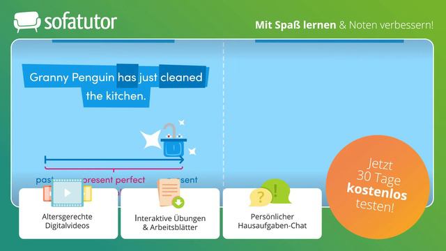 Das Video in voller Länge findest du unter: https://www.sofatutor.com/v/6bm/gZ4. Du möchtest das present perfect progressive erkunden? Du willst wissen, wie denn die Bildung dieser Zeitform funktioniert und wie genau die Verwendung aussieht? Dann bist du hier genau richtig: Klick in unser Video und lass dir von Grannie Penguin erzählen, was ihre Enkelkinder denn alles so tun. Teste dich danach und klick in unsere interaktive Übung – so bereitest du dich super vor für die nächste Klassenarbeit. Du möchtest mehr zum Thema Present Perfect Progressive Erklärung Deutsch lernen, dann klicke auf https://www.sofatutor.com. Alles zur Thematik Present Perfect Progressive schnell und einfach erklärt!