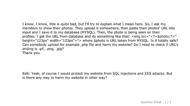 MySQL : Can something "bad" happen via img src? [ Beautify Your Computer : https://www.hows.tech/p/recommended.html ] MySQL : Can something "bad" happen via img src? Note: The information provided in this video is as it is with no modifications. Thanks to many people who made this project happen. Disclaimer: All information is provided as it is with no warranty of any kind. Content is licensed under CC BY SA 2.5 and CC BY SA 3.0. Question / answer owners are mentioned in the video. Trademarks are property of respective owners and stackexchange. Information credits to stackoverflow, stackexchange network and user contributions. If there any issues, contact us on - htfyc dot hows dot tech #MySQL:Cansomethingbadhappenviaimgsrc? #MySQL #: #Can #something #"bad" #happen #via #img #src? Guide : [ MySQL : Can something "bad" happen via img src? ]