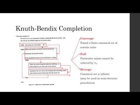In this series of videos, I will go through the paper by A. J. Dick in 1991 on "An Introduction to Knuth-Bendix Completion". This paper aims to provide an informal and intuitive introduction to many of the concepts essential to a clear understanding of Knuth-Bendix Completion. Original paper: https://www.researchgate.net/publication/220460160_An_Introduction_to_Knuth-Bendix_Completion Download the slides (with animation ppt format): https://www.dropbox.com/s/cdjc5u0c00wa5x6/KBC.pptx?dl=0 Download the slides (without animation pdf format): https://www.dropbox.com/s/d2knw0mpzwnmixd/KBC_print.pdf?dl=0