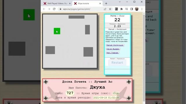 https://wpvi.ru/pages/games/pilot/ - И снова очередная моя попытка побить легендарный рекорд Пилота Джухи - 727 очков, который он поставил почти 2 года тому назад, а конкретно 2021-09-19 01:32:08. И опять безуспешно! Даже близко не подошел, лучший результат не достигает даже 600 очков. У меня пока не получилось. Может, у Вас получится? Пробуйте! Игра очень простая, не требуется никакой регистрации и прочего. Просто жмите ссылку и играйте: https://wpvi.ru/pages/games/pilot/ Успехов! ###