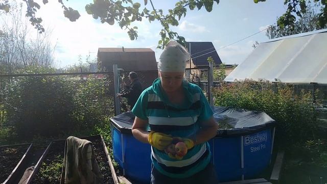 Мама, муж и я снимаем яблоки, убираем бассейн.
