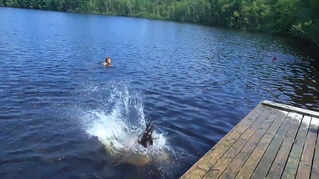 Купальщица стоит спиной к воде, а потом прыгает в неё.