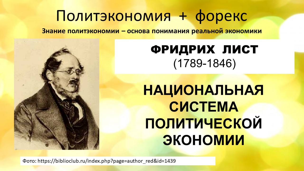 Современная макроэкономическая теория ориентирована в основном на исследование функциональных зависимостей между переменными, характеризующими состояние национальной экономики. Она определенно недостаточна для объяснения коренных экономических перемен. Здесь следует добавить, что и реальным управлением хозяйственным развитием тоже. Для этого требуется теория, предметом рассмотрения которой являются процессы на уровне национально-государственных систем, а также методические указания по использованию теорий. Средневековье долгое время удовлетворялось скромным и редким достатком. Возрождение пробудило коммерцию, индустрию, морское сообщение, дух предпринимательства, которые требовали создание богатства. В современных идеологических дебатах постоянно противопоставляются экономический либерализм и смесь взглядов в экономической науке, связанная с марксистской теорией. Ролик «Марксист ли К. Маркс» на канале. В истории Германии много экономистов, которые смогли оставить после себя след в экономической науке. Конечно, наиболее известен К. Маркс. На его фоне остальные менее заметны, но в Германии их помнят и почитают. Один из наиболее известных - Фридрих Лист. (1789-1846) Для занимавшиеся музыкой фамилия Лист, хорошо известна, но тот звался Ференц. Направление в экономической науке, которое создал Ф. Лист — экономический национализм. По определению, каждая нация составляет органическое целое. Мирабо один из самых знаменитых ораторов и политических деятелей Франции сравнивал Францию с деревом: корень есть сельское хозяйство, ветви — индустрия, листья — коммерция. Если одна часть отмирает или находится в опасности — то и другие, следом за ней, отомрут или подвергнутся опасности. Нельзя забывать ни об одном секторе экономики. В недрах нации имеет место тесная взаимозависимость регионов (территорий), всех форм и видов труда, всех общественных и профессиональных категорий. Власть должна постоянно помнить об этой солидарности и усиливать её, но это требует закрытия границ. За границами — другие правила и законы. Исторические условия. Германия в первой половине XIX века была страной, раздробленной на множество государств — замкнутых и приспособленных лишь для ограниченных отношений. Отсталая промышленность Германии практически не способствовала формированию внутреннего рынка, а территория не была защищена от импорта товаров-конкурентов. Политическая раздробленность земель не способствовала появлению крупных промышленных капиталов и не могла выдержать конкуренцию с промышленностью более развитых зарубежных стран - прежде всего, Англии и Франции. По отношению к соседним нациям никаких пошлин не существовало. Германские государства закрывали свои границы друг для друга, но Германия в целом, лишенная действительной центральной власти, оставалась открытой для иностранных товаров. В результате, исторические обстоятельства не могли не отразиться на политической экономии. К началу XIX века объединение различных государств в Великобританию уже Смит рассматривал как «одну из главных причин процветания». Во Франции уничтожение внутренних таможенных ограничений в 1791 г создало единое экономическое пространство государства, которое также обеспечивало высокий экономический рост. Немецкая экономическая наука не приня