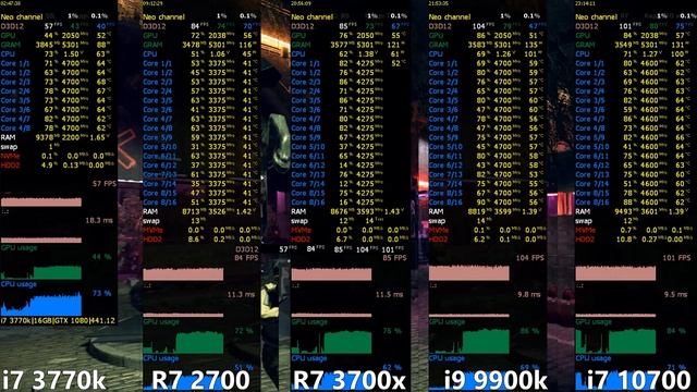 i7 3770k OC vs Ryzen 7 2700 vs Ryzen 7 3700x vs i9 9900k vs i7 10700 in 15 Games ??? Look at what bonuses I offer to sponsors: https://www.youtube.com/channel/UCO346ZpBN8jnD0fsqgF2stA/join Voluntary donations for the channel: https://www.youtube.com/c/NeochannelNeochannel/about I will be grateful for the help to the channel! Timecode: 00:00 system configuration 00:30 Metro Exodus (2019) 02:48 Assassins Creed Origins (2017) 05:29 Cyberpunk 2077 (2020) 08:34 Far Cry 5 (2018) 10:01 Need for Speed: Payback (2017) 12:24 Total war Three Kingdoms (2019) 14:21 Tom Clancy's Ghost Recon Breakpoint (2019) 17:43 Watch Dogs Legion (2020) 19:48 Shadow of the Tomb Raider (2018) 23:12 The Witcher 3 Wild Hunt (2015) 26:29 Assassin's Creed Odyssey (2018) 28:10 Battlefield 5 (2019) 31:16 Red Dead Redemption 2 (2019) 34:04 Gears 5 (2019) 35:32 Borderlands 3 (2019) 37:46 Results System configuration: CPU 1: Intel Core i7 3770k (4.7 GHz) CPU 2: AMD Ryzen 7 2700 (3.38 GHz) CPU 3: AMD Ryzen 7 3700x (4.3 GHz) CPU 4: Intel Core i9 9900k (4.7 GHz) CPU 5: Intel Core i7 10700 (4.6 GHz) MOTHERBOARD 1: Asus P8P67 (rev 3.1) MOTHERBOARD 2: GigaByte X570 UD (rev 1.0) MOTHERBOARD 3: GigaByte Z390 AORUS Pro (rev 1.0) MOTHERBOARD 4: Asus ROG Strix Z490-H Gaming RAM 1: DDR3 TEAM GROUP Vulcan (2х8 Gb), 2200 MHz RAM 2: DDR4 Crucial Ballistix Sport (2x8 Gb), 3533, 3600 MHz GPU: GeForce GTX1080 8 Gb (GDDR-5x) GigaByte AORUS SSD: M.2 Team T-Force cardea 240 Gb (SWAP files) HDD: Seagate barracuda 5900 rpm, 2 Тб (Games) Cooler: Custom water cooling (rad 120x240 mm) Power: FSP EVEREST 85PLUS 800W I apologize in advance for the quality, youtube reduces the quality in some places. ____ #i73770k #Ryzen73700x #corei710700 #corei99900k #ryzen72700 #stock #benchmark #intel #corei5 #GigaByte #aorus #gtx1080 #asusROGStrixZ490H #ASUS #Z490 #intel #AMD