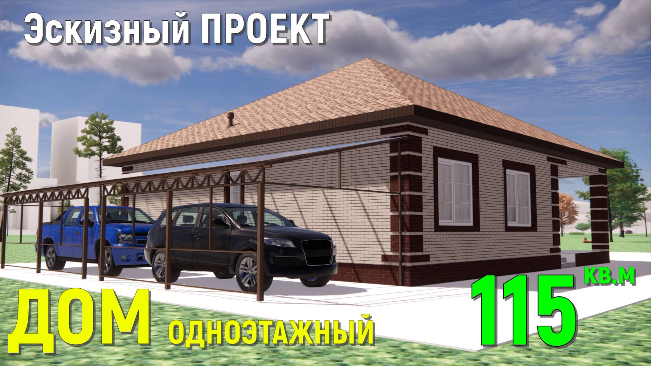 КРАСИВЫЙ КИРПИЧНЫЙ ОДНОЭТАЖНЫЙ ДОМ 115 кв. 12х13м. 3D ЭСКИЗНЫЙ ПРОЕКТ