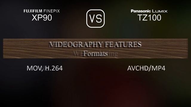 This video overviews the Fujifilm FINEPIX XP90 and the Panasonic Lumix TZ100 in a parallel comparison of specifications. Thanks for watching. If you liked this video and found it informative, make sure to subscribe for more. 00:25 LAUNCH 00:33 BODY 00:40 SENSOR 01:01 IMAGE 01:16 OPTICS & FOCUS 01:55 SCREEN 02:13 VIEWFINDER 02:27 PHOTOGRAPHY FEATURES 03:20 VIDEOGRAPHY FEATURES 03:35 STORAGE 03:38 CONNECTIVITY 04:03 PHYSICAL 04:21 MISC