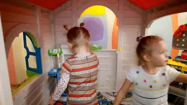Валерка и Аришка играются в игрушечном домике