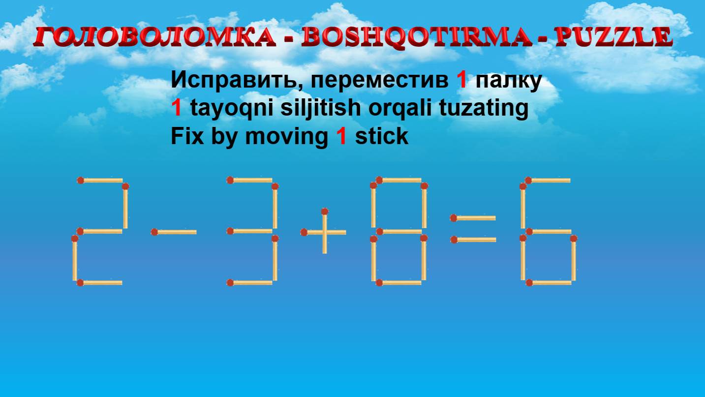 ГОЛОВОЛОМКА - BOSHQOTIRMA – PUZZLE. Спичка. 2-3+8=6, 9+5-4=5, 4+6-3=5, 7+8+9=17