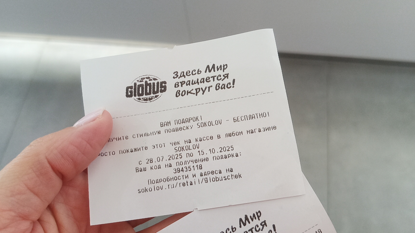 Подарок в чеке из магазина Глобус - подвеска в магазине SOKOLOV абсолютно бесплатно.