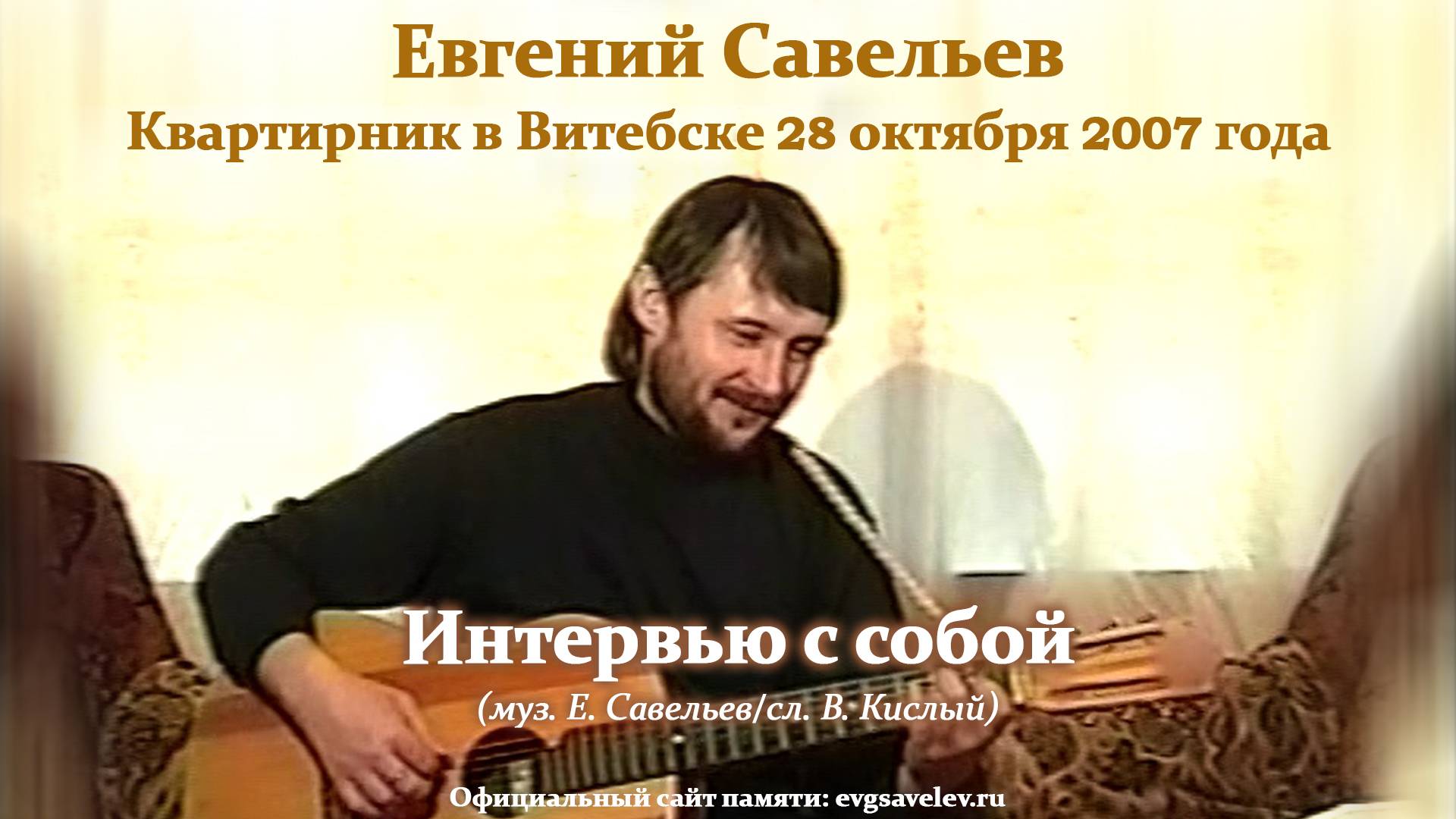 Концерт состоялся в квартире друга Евгения Савельева — Александра Ивановича Баталкина. Судя по всему, это лишь фрагмент выступления. К сожалению, полная версия на сегодняшний день утрачена. До наших дней дошла запись всего восьми песен. С момента съёмки прошло уже много лет, качество соответствует возможностям того времени. Строго не судите! Плейлист с этим концертом, там все песни идут по порядку: https://rutube.ru/plst/1130218/ Евгений Савельев (Савва) 30.07.1971 – 21.04.2020 Официальный сайт: https://evgsavelev.ru Группа памяти ВК: https://vk.com/evgsavelev Группа памяти ОК: https://ok.ru/esavelev Слушать песни: https://music.yandex.ru/artist/7200679