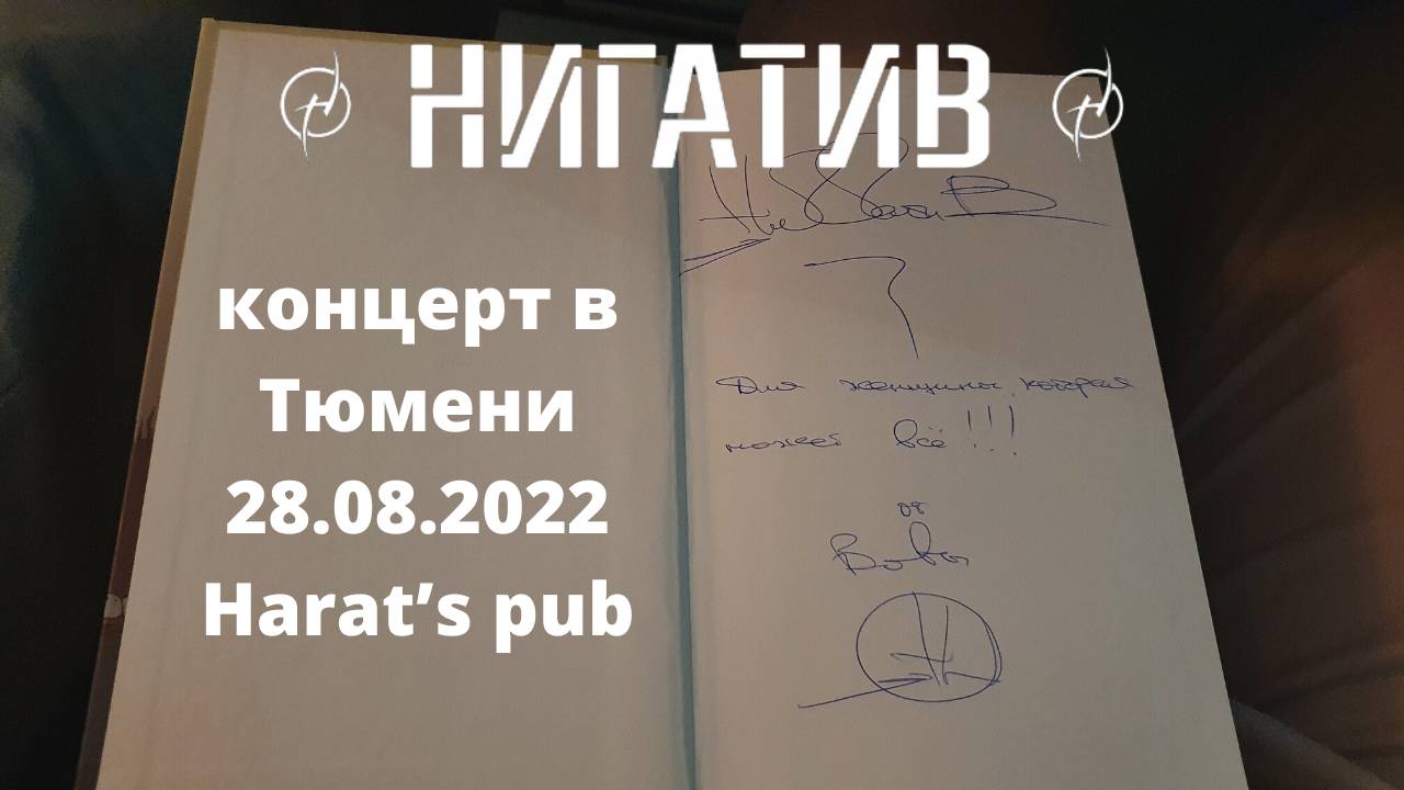 https://dzen.ru/super_woman https://vk.com/club222972442 28.08.2022 г. в Тюмени (в Harat's Pub) состоялся концерт моего любимого рэп исполнителя Нигатива. Нигатив (Владимир Владимирович Афанасьев) - российский рэпер и музыкант, бывший солист краснодарской рэп-группы «Триада», актёр (Реальные пацаны, На районе, Тобол, Патриот и др.). Владимир не только прекрасный поэт, певец, но и замечательный актёр. Каждую свою песню он не просто поёт, но и эмоционально переживает на сцене. Всегда очень интересно его не просто слушать, но и наблюдать за актёрским мастерством. Не так давно Владимир написал книгу "Фан - Fun", которую можно было купить на концерте и тут же сфотографироваться с автором и получить автограф. Мы конечно же пренепременно воспользовались этим))) 00:00 - Начало; 00:57 - Крылья; 04:07 - Оболочка; 05:03 - Скучаю; 07:27 - Невесомость; 10:20 - До дна; 13:49 - На руках; 16:27 - Времени нет; 18:52 - Отпусти; 22:21 - Эпилог (фото, автограф).