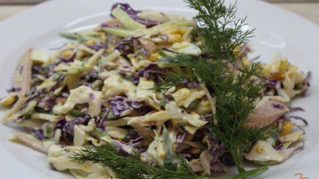 Легкий в приготовлении и вкусный салатик. Ингредиенты: Капуста белокочанная - 70 гр., Капуста синяя - 50 гр., Яйцо куриное - 1 шт., Огурец свежий - 45 гр., Лук зеленый - 5 гр., Сосиски - 50 гр., Кукуруза консервированная - 40 гр., Чеснок - 5 гр., Майонез - 60 гр., Соль - щепотка, Перец черный молотый - щепотка, Укроп - 2 гр., Благодарим за просмотр! Подписывайтесь на канал🍕 Поделитесь своим мнениенм о рецепте в комментариях!