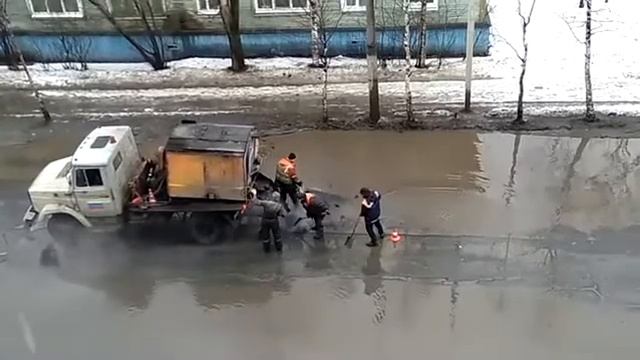 Асфальт в лужу. В Архангельске дорожная служба ремонтирует дорожное покрытие укладывая асфальт в воду. #Архангельск #лужа #асфальт