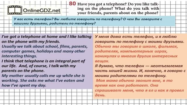 Другие решения смотри тут: https://urokitv.net/49-angliyskiy-yazyk-7-klass-biboletova-m-z Urokitv.net это школьные учебники и решебники с 1-го по 11-й класс школы. Ждем ваших предложений и пожеланий. Если вам нравится, то что мы делаем расскажите про нас своим друзьям и одноклассникам. В упражнении 80 необходимо ответить на вопросы, касающиеся использования вами телефона. Предлагаем вам посмотреть наше видео с решением. Unit 1 Section 10 Задание №80 - Английский язык "Enjoy English" 7 класс (Биболетова)