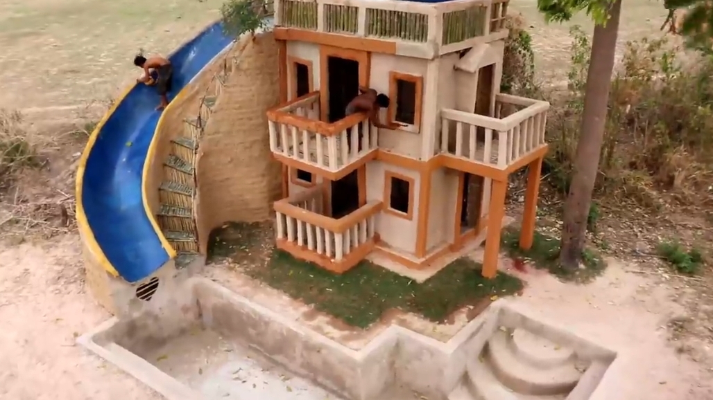 Строят домик с горкой и бассейном из палок и глины , своими руками.