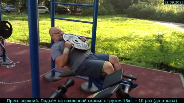 12.09.2023 - Пресс верхний. Подъём на наклонной скамье с грузом 15кг. - 10 раз (до отказа)