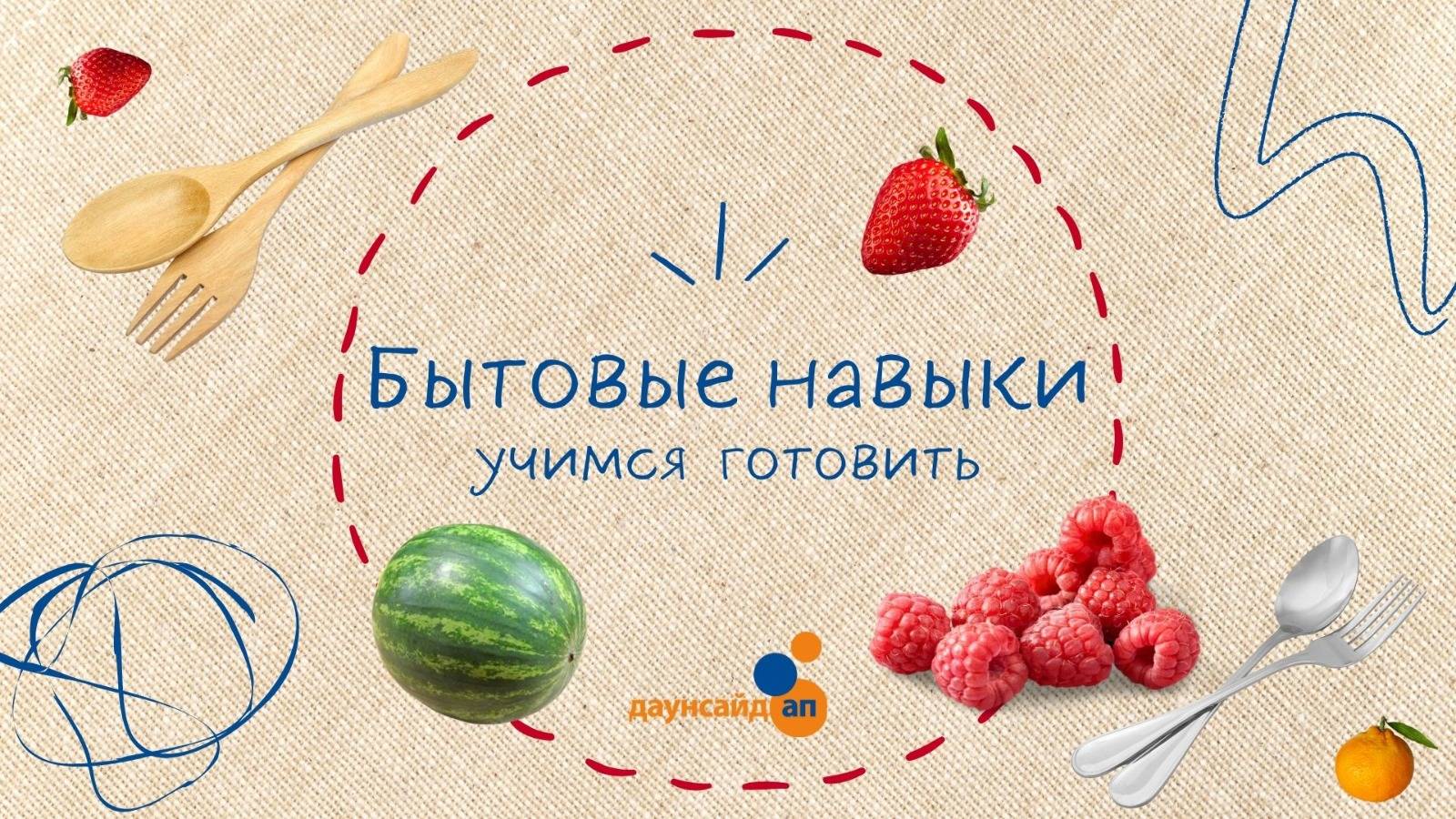 Видеозапись фрагмента занятия, во время которого его участники учатся пользоваться кухонными принадлежностями и готовить фруктовый салат