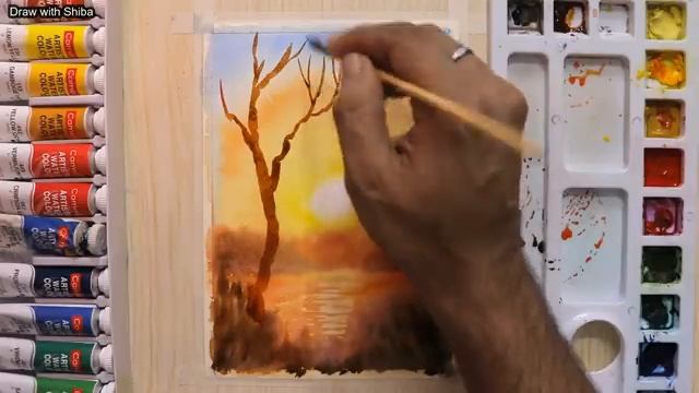 Простой пошаговый урок рисования акварелью красивый закат и дерево для начинающих
