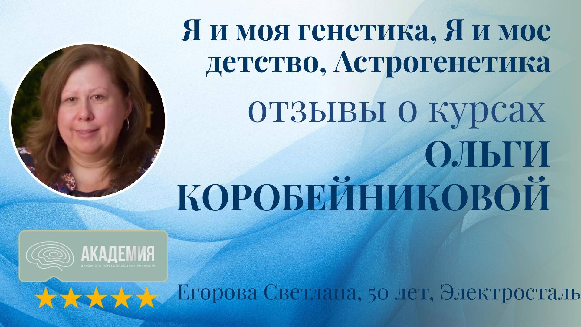 Отзывы о курсах Ольги Коробейниковой 30: "Я и моя генетика," "Я и мое детство," "Астрогенетика" 30. Светлана Егорова, 50 лет, Электросталь Точка А: Состояние до курса Запрос на лучшее понимание себя и своего окружения, стремление к развитию и познанию нового. Светлана отмечает, что курсы Ольги оказались для нее глубокими и структурированными, превосходящими по качеству другие обучающие программы. Путь к изменениям: Как курсы Ольги Коробейниковой помогли Подробно изучала курсы и следовала рекомендациям и практикам, предложенным Ольгой. Точка Б: Результаты после курсов Ольги Коробейниковой Окружение изменилось: в жизни начали появляться более осознанные и успешные люди. Стала лучше понимать себя и окружающих. Отзывы о курсах Ольги Коробейниковой подчеркивают, что такие программы, как "Астрогенетика" и "Я и мое детство," помогают участникам глубже понять себя и привлекают в их жизнь более осознанное окружение.