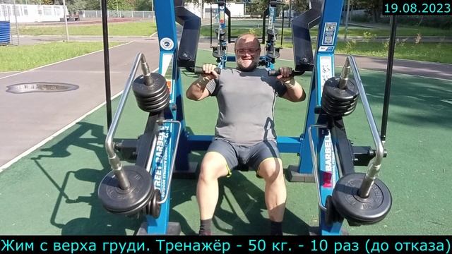19.08.2023 - Жим с верха груди. Тренажёр - 50 кг. - 10 раз (до отказа)