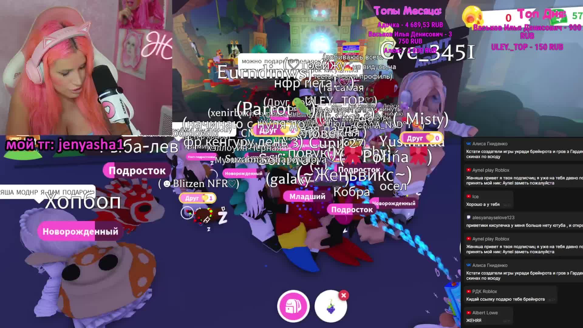 Grow a garden , Adopt Me ! Мертвые рельсы Мир Дэнди ROBLOX СТРИМ Женяша ✅ голосовой донат https://www.donationalerts.com/r/larionovi 💲💲💲💲💲 ✅отправить мем https://memealerts.com/64559f017931e162891da29b ★Есть разные вариации донатов★ ★**донат от 150р ваш текст озвучен**★ ★75+руб★ Мой стиль собачки ★150+руб★ Песня Пинк Винс ★230+руб★ Донейшен дэнс ★240+руб★ Моя собачка одета дороже тебя ★250+руб★ Кошечка гламур ★300+Стрим Женяшечки моей ★500+руб★Хей малышка, клевая стрижка ★666руб СКРИМЕР РЕЗКИЙ СТРАШНЫЙ ЗВУК ★700+руб ★ Мексиканец-спарта ★1000+руб★ Сейчас будет ТАЧДАУН... Первые ссылку получают из рубрики ВИП ЛЮДИ из моего дискорда (кто оформил спонсорку у меня на Boosty или через донат ══════════════════════════════════════════ Роль ВИП -1000р через донат (с указанием ник рб) или на сайте https://boosty.to/jenyasha Оформление спонсорки ВИП кисуля и добавления в друзья только через Бусти!! Випы видят скрытые каналы, где я присылаю ссылку в игры на стримах и отвечаю на вопросы им -получить роль в дискорде и в телеграмм написать моему админу Алекс @)alexmukk тг Пообщаться на стриме через тг или дискорд стать топ 1-2 на стриме Мой ник в роблокс: jenyasha Мои Соц.сети: https://hipolink.me/jenyasha