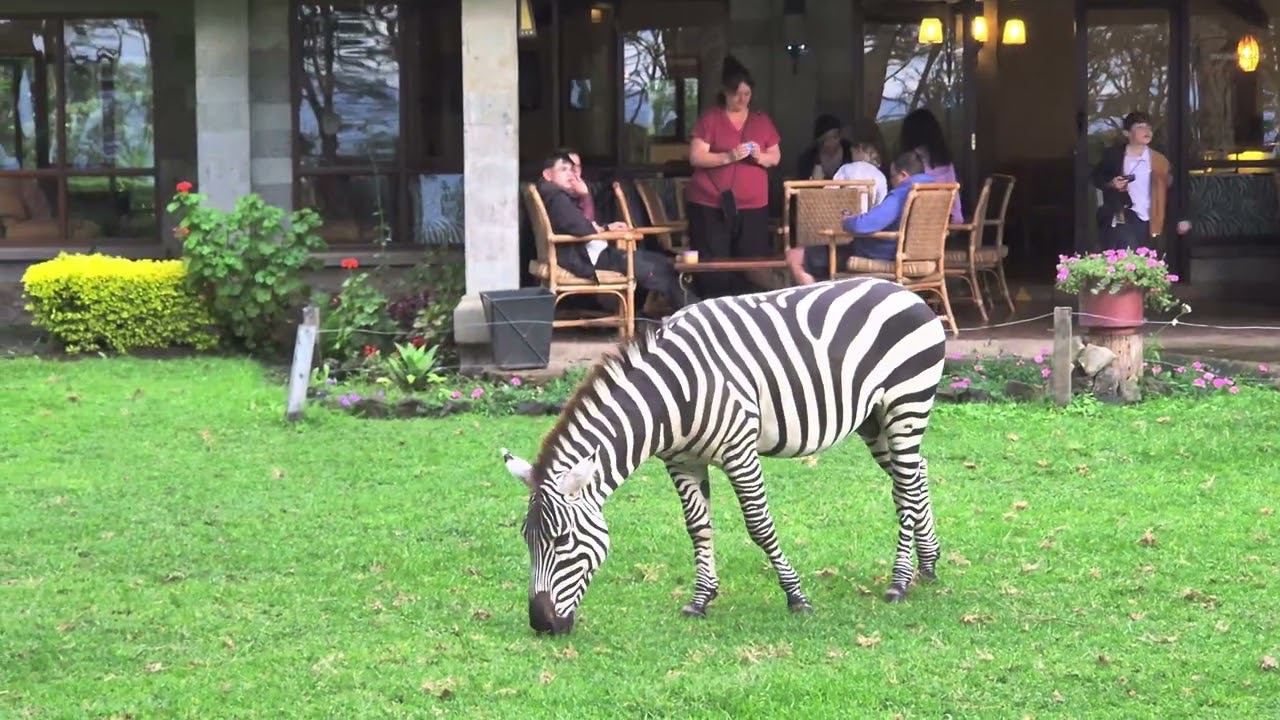 A #zebra walks around the hotel.