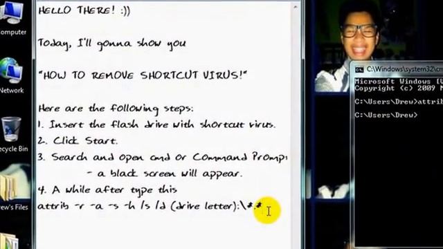 Steps on how to remove shortcut virus using cmd (Command Prompt). code to be written in the CMD! :)) attrib -r -a -s -h /s /d (E):\*.* inside the parenthesis , encode the letter of the flashdrive.. thank you! :))