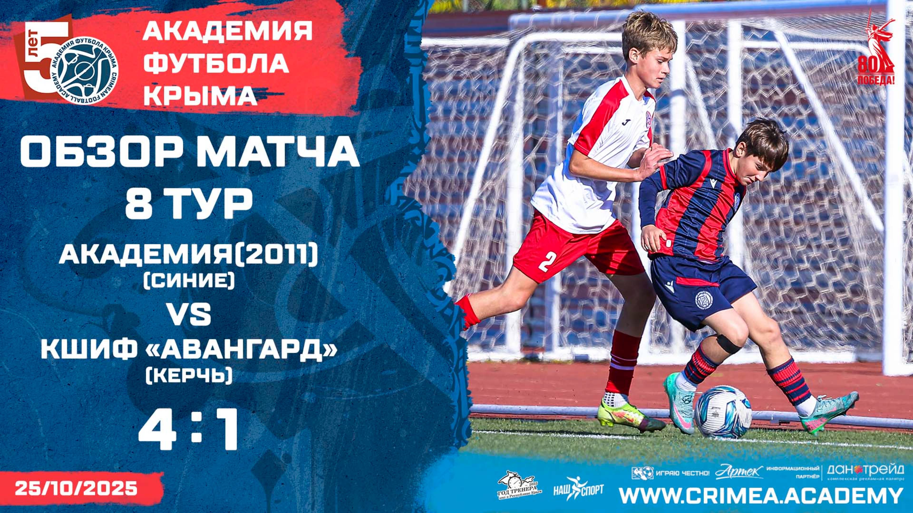 Обзор матча восьмого тура Открытого первенства детско-юношеской футбольной лиги Крыма среди юношей 2011 г.р.(2025/2026): Академия футбола Крыма" (2011)-синие - КШИФ "Авангард" (Керчь) Наш сайт: https://www.crimea.academy/ Академия футбола Крыма – это большая футбольная семья, которая открыта для общественности и готова к взаимному сотрудничеству, обмену опытом и профессиональному общению. Наша цель – подготовка качественных и конкурентоспособных футболистов с учетом современных требований, а также образованных и всесторонне развитых членов современного общества. Наша приоритетная задача – отбор детей, проявивших выдающиеся способности в области футбола для совершенствования их спортивного мастерства. Команды Академии ориентированы на атакующий и зрелищный футбол, в котором удовольствие получает не только сам игрок, но и зритель. При этом интересы команды не должны идти в ущерб задаче воспитания отдельного футболиста. В основе воспитания юных футболистов в нашей Академии лежит принцип – "подготовка игрока, а не команды". #футбол #спорт #СвернёмГоры #football #soccer #sport