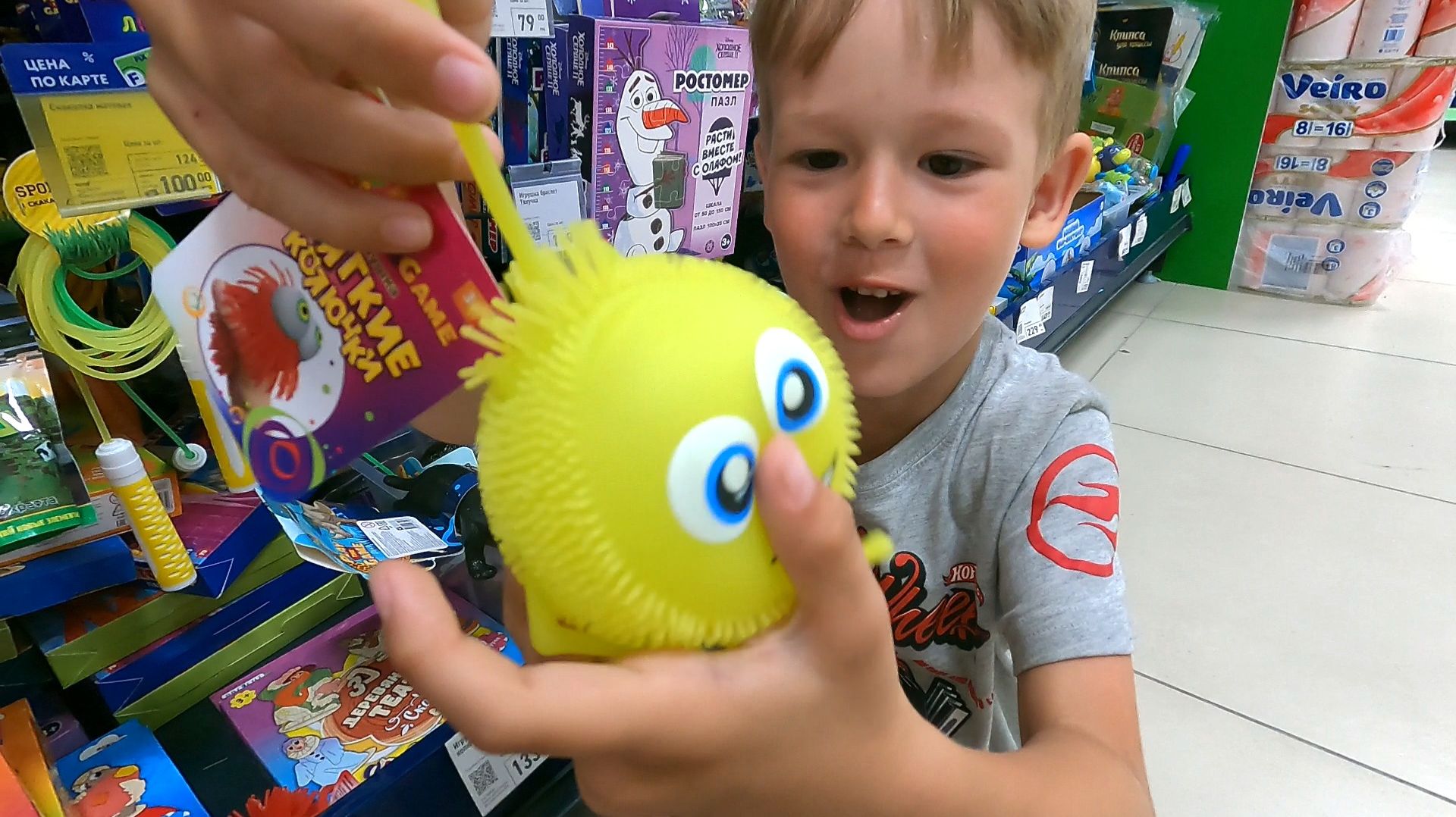 Рома в магазине смотрит игрушки для детей.