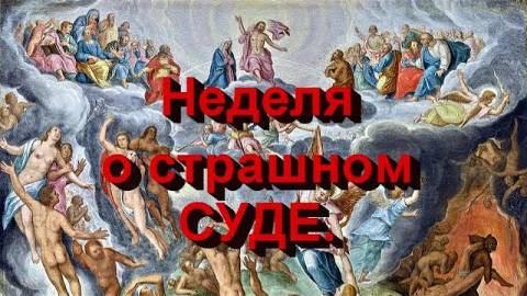 Неделя о страшном суде. Неделя Мясопустная (о Страшном Суде) - предпоследнее воскресение перед Великим постом, в которое по уставу кончается употребление в пищу мяса. В это воскресение вспоминается грядущий Страшный суд (Мф. 25:31-46). Это напоминание необходимо для того, чтобы люди согрешающие не предались беспечности и нерадению о своем спасении в надежде на неизреченное милосердие Божие.