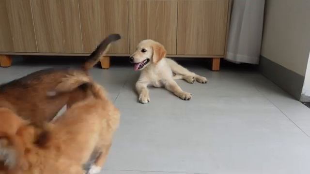 Золотистый ретривер и щенки празднуют, когда кошечка впервые становится мамой