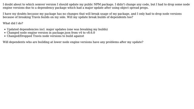 Software Engineering: Change semver versioning after dropping node eninge versions Helpful? Please support me on Patreon: https://www.patreon.com/roelvandepaar With thanks & praise to God, and with thanks to the many people who have made this project possible! | Content (except music & images) licensed under CC BY-SA https://meta.stackexchange.com/help/licensing | Music: https://www.bensound.com/licensing | Images: https://stocksnap.io/license & others | With thanks to user Tarabass (softwareengineering.stackexchange.com/users/189287), user Bart van Ingen Schenau (softwareengineering.stackexchange.com/users/5099), and the Stack Exchange Network (softwareengineering.stackexchange.com/questions/392719). Trademarks are property of their respective owners. Disclaimer: All information is provided "AS IS" without warranty of any kind. You are responsible for your own actions. Please contact me if anything is amiss at Roel D.OT VandePaar A.T gmail.com