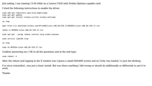 Ubuntu: Nvidia 319.17 - 640 x 480 screen and no unity post reboot Helpful? Please support me on Patreon: https://www.patreon.com/roelvandepaar With thanks & praise to God, and with thanks to the many people who have made this project possible! | Content (except music & images) licensed under cc by-sa 3.0 | Music: https://www.bensound.com/royalty-free-music | Images: https://stocksnap.io/license & others | With thanks to user user155225 (https://askubuntu.com/users/155225), user Ubuntuser (https://askubuntu.com/users/9302), user John WH Smith (https://askubuntu.com/users/175072), and the Stack Exchange Network (http://askubuntu.com/questions/290173). Trademarks are property of their respective owners. Disclaimer: All information is provided "AS IS" without warranty of any kind. You are responsible for your own actions. Please contact me if anything is amiss at Roel D.OT VandePaar A.T gmail.com.