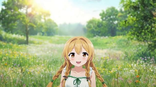 Аниме-портрет девушки с золотыми косами и тёмно-карими глазами, на ней бело-зелёное платье в летнем стиле; она с улыбкой стоит на рассветном лугу, покрытом полевыми цветами; солнечные лучи, лёгкий утренний ветерок, общая атмосфера умиротворения и нежности, подчёркивающая естественную красоту героини.