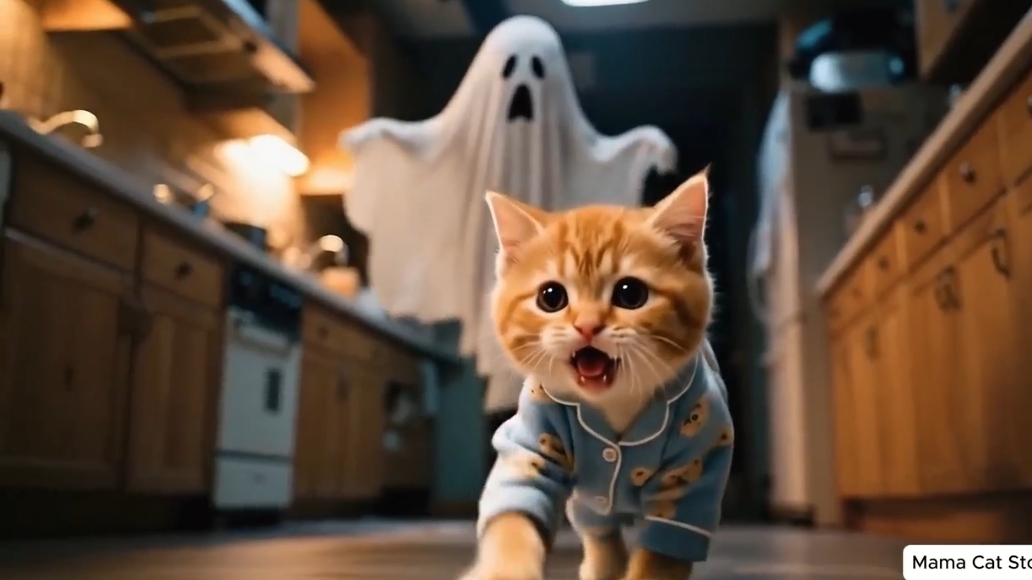 Рыжий котенок боится привидений.