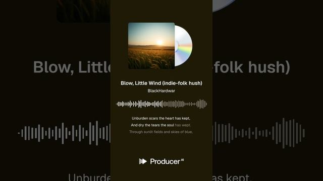 Blow, Little Wind (indie folk hush) hushed indie-folk with intimate fingerpicked acoustic guitar, soft piano flourishes, airy pads, subtle brushed percussion, close breathy vocal, warm room reverb, gentle dynamics, organic texture, lullaby-like calm https://www.producer.ai/BlackHardwar https://songly.gift/ru/app/videos/create https://sinonim.org/song#res Lyrics Verse 1: A whisper soft on silver light, Where shadows dance and fade from sight. I call upon the gentle air, To lift away this heavy care. With silent grace and ancient might, Please make the darkness turn to bright. Chorus: Oh, blow, little wind, so soft and low, And let the streams of healing flow. With every breath, a soothing sound, Let peace and wholeness now be found. Oh, blow, little wind, and heal the pain, And make my spirit whole again. Verse 2: Let leaves of green and morning dew Bring calming strength and something new. Unburden scars the heart has kept, And dry the tears the soul has wept. Through sunlit fields and skies of blue, Your gentle touch will see me through. Chorus: Oh, blow, little wind, so soft and low, And let the streams of healing flow. With every breath, a soothing sound, Let peace and wholeness now be found. Oh, blow, little wind, and heal the pain, And make my spirit whole again. Bridge: A quiet spell, a hopeful plea, Carried on the breeze to me. The wounds unseen, the silent ache, For goodness and for mercy's sake. Outro: Blow, little wind... and set me free... Just heal the wounds inside of me. So soft and low... Let healing flow...