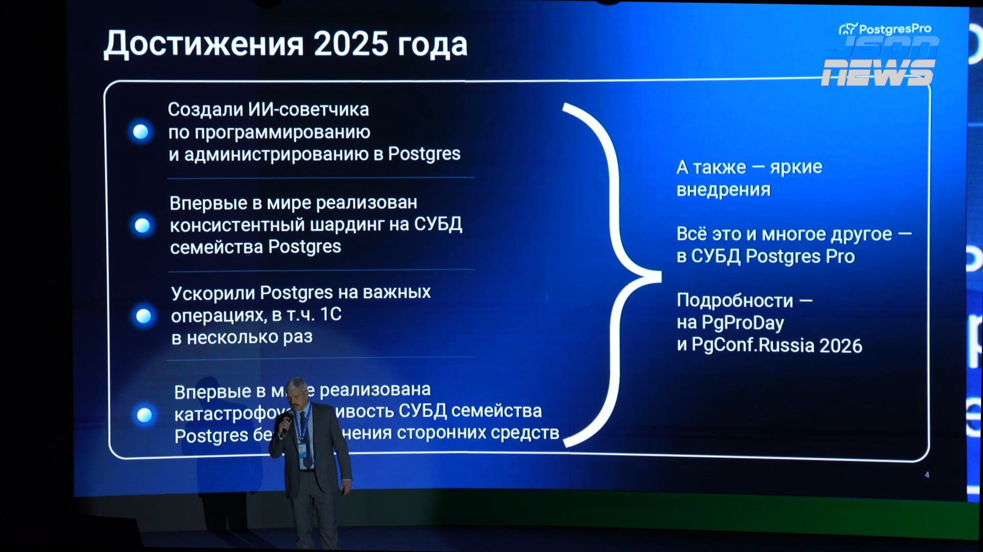 Иван Панченко, Генеральный директор Postgres Professional. Компания «Постгресс Профессионал» — главный российский разработчик PostgreSQL. • Фокус на создании экосистемы для работы с данными и платформенных решений. Технологические достижения • Разработка системы консистентного шардинга для горизонтального масштабирования баз данных. • Достижения в области искусственного интеллекта. • Стремление к созданию передовых решений, а не к воспроизведению чужих результатов. Проблемы при крупных внедрениях. • Проблемы на стыках зон ответственности разных вендоров. • Необходимость решения сложных проблем, даже если они находятся вне зоны компетенции. Пример с логической репликацией • Проблемы с логической реплифкацией в PostgreSQL на больших масштабах. • Решение проблемы путём внесения изменений в PostgreSQL и опенсорсное решение. • Важность объединения усилий разных специалистов для решения сложных задач. Пример с управлением планами запросов • Проблемы с управлением планами запросов в PostgreSQL. • Разработка расширения для улучшения управляемости планов запросов. • Успешное внедрение расширения в нефтегазовой системе. Партнёрство и кросс-вендерные решения • Важность партнёрских отношений и кросс-вендерных команд. • Примеры успешного решения проблем совместными усилиями. • Необходимость обмена информацией и знаниями между компаниями. Контроль доступа на уровне строк • Проблемы с контролем доступа на уровне строк в PostgreSQL под большой нагрузкой. • Внесение изменений в PostgreSQL для улучшения производительности. • Подчёркивание важности честности с заказчиком и предоставления обоснованных аргументов. Пример из банковской системы • Решение разместить информацию на одном сервере справочника вместо дублирования на все узлы. • Медленная работа системы из-за такого решения. • Аргументы архитекторов, которые убедили заказчика в необходимости изменений. Репликация и сжатие данных • Репликация данных на каждый сервер и сжатие данных в Post Pro Enterprise оказались выгодными решениями. • Без сжатия данных решение было бы невыгодным. • Грамотный архитектор-вендер помог запустить систему под высокой нагрузкой. Разнородность аналитических баз данных • Аналитические и транзакционные базы данных разнородны по своему внутреннему устройству, но могут эффективно объединяться по внешним интерфейсам и стилю работы. • Это одно из направлений развития компании. CNews FORUM 2025: Информационные технологии завтра.