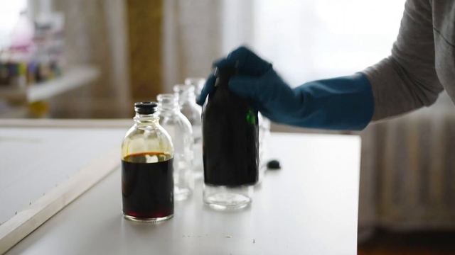 Приготовление красящего раствора. Инструкция по разведению прилагается к краскам. Раствор развожу в стеклянных бутылях от медицинских растворов из аптеки. Они устойчивые, имеют шкалу в мл, симпатично выглядят. На каждую бутылку повешен ярлык с кусочком шелка, на котором выполнена цветовая растяжка цветом, это значительно облегчает поиск цвета.