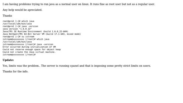 DevOps & SysAdmins: Cannot run java as regular linux user Helpful? Please support me on Patreon: https://www.patreon.com/roelvandepaar With thanks & praise to God, and with thanks to the many people who have made this project possible! | Content (except music & images) licensed under CC BY-SA https://meta.stackexchange.com/help/licensing | Music: https://www.bensound.com/licensing | Images: https://stocksnap.io/license & others | With thanks to user splattne (serverfault.com/users/45), user Roger (serverfault.com/users/66367), user Kjetil Joergensen (serverfault.com/users/3002), and the Stack Exchange Network (serverfault.com/questions/220892). Trademarks are property of their respective owners. Disclaimer: All information is provided "AS IS" without warranty of any kind. You are responsible for your own actions. Please contact me if anything is amiss at Roel D.OT VandePaar A.T gmail.com