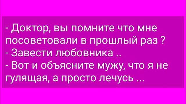 0:03 голосую девушка у дороги останавливается 0:06 водитель и спрашивает куда едем мне 0:08 пожалуйста в город хорошо с 0:11 удовольствием вас подвезу девушка 0:13 испуганно мне не надо с удовольствием я 0:15 заплачу 0:20 привозит молодой лейтенант жену в 0:22 гарнизон в общаге лежат на кровати друг 0:24 молодуха как засмеётся муж спрашивает ты 0:27 что он отвечает вот глаза закрываю ну 0:31 дура дурой открываю да нет жена офицера 0:39 доктор вы помните что мне посоветовали в 0:41 прошлый раз завести любовника вот я без 0:44 ники мужу что не гулящая а просто лечусь 0:51 женщин обижать не надо у них от милой 0:54 зайки до жутко ведьмы разгон полторы 0:56 секунды а тормозного пути нет 1:02 после авиа крушения на остров попадают 1:04 несколько мужчин 20-летний 30-летний 1:07 40-летний и пенсионер увидели на 1:09 соседнем острове группы женщин 20-летний 1:12 с криком девочки я к вам прыгает воду 1:15 30-летний вода холодная может плод 1:18 построен 40-летний подождите скоро они 1:22 сами сюда приплывут пенсионер а зачем 1:25 куда-то плавать у меня бинокль есть