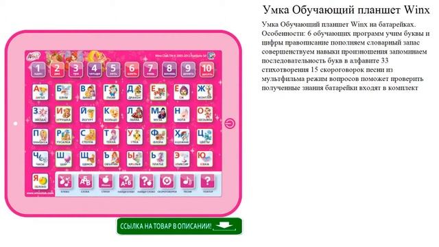 http://tut-ok.ru/elektronnye_igrushki/25840.php Умка Обучающий планшет Winx на батарейках. Особенности: 6 обучающих программ учим буквы и цифры правописание пополняем словарный запас совершенствуем навыки произношения запоминаем последовательность букв в алфавите 33 стихотворения 15 скороговорок песни из мультфильма режим вопросов поможет проверить полученные знания батарейки входят в комплект #Детские #игрушки #электронные и #машинки для #детей на нашем канале мини видео обзоры.