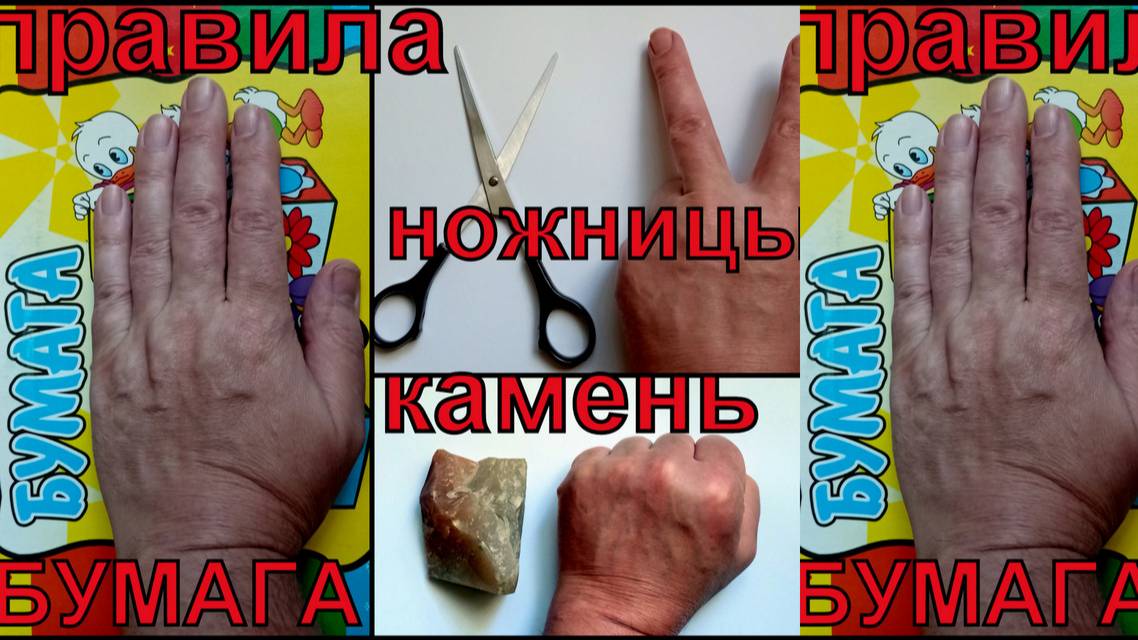 Древнейшая игра людей на руках и пальцах - камень, ножницы, бумага. Или более древняя игра - камень, шило, лист. Правила: Камень побеждает ножницы (ножницы затупятся или сломаются о камень). Ножницы побеждают бумагу (бумагу можно разрезать ножницами). Бумага побеждает камень (камень легко завернуть в бумагу). Считается, что эта игра является потомком китайской цу-е-фа или су-е-фа. Проигрывают многие потому, что не знают правила игры - камень, ножницы бумага. Успех в игре зависит от наблюдательности, ловкости, хитрости и умении манипулировать сознанием других людей.