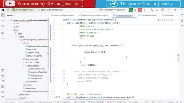 Задонатить: https://yoomoney.ru/to/4100110584940159 Курс по Spring framework на языках Java/Kotlin на примере разработки клиент-серверного приложения для заказа шаурмы) Исходный код ко всем урокам по модулю "JDBC Template" (JdbcTemplate/NamedParameterJdbcTemplate): https://github.com/AslanJavasky/shawarmadelivery_java/tree/spring-data-jdbctemplate https://github.com/AslanJavasky/shawarmadelivery_kotlin/tree/spring-data-jdbctemplate Задонатить преподавателю: Карта Сбер: 5469 6000 2144 3601 (Аслан) Карта Т-Банк: 2200 7001 1633 9259 (Аслан) Карта Альфа-Банк: 2200 1523 1074 7517 (Аслан) ЮMoney(ЯндексДеньги): 4100110584940159 для донатов из-за рубежа: https://www.donationalerts.com/r/aslan_javasky Спасибо :) Без VPN: https://vkvideo.ru/playlist/-229755761_3