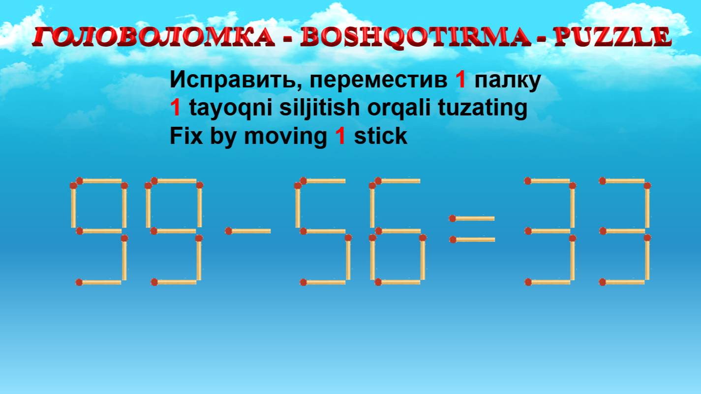 ГОЛОВОЛОМКА - BOSHQOTIRMA – PUZZLE. Спичка. 99-56=33, 93-58=26, 99-30=58, 80-38=49