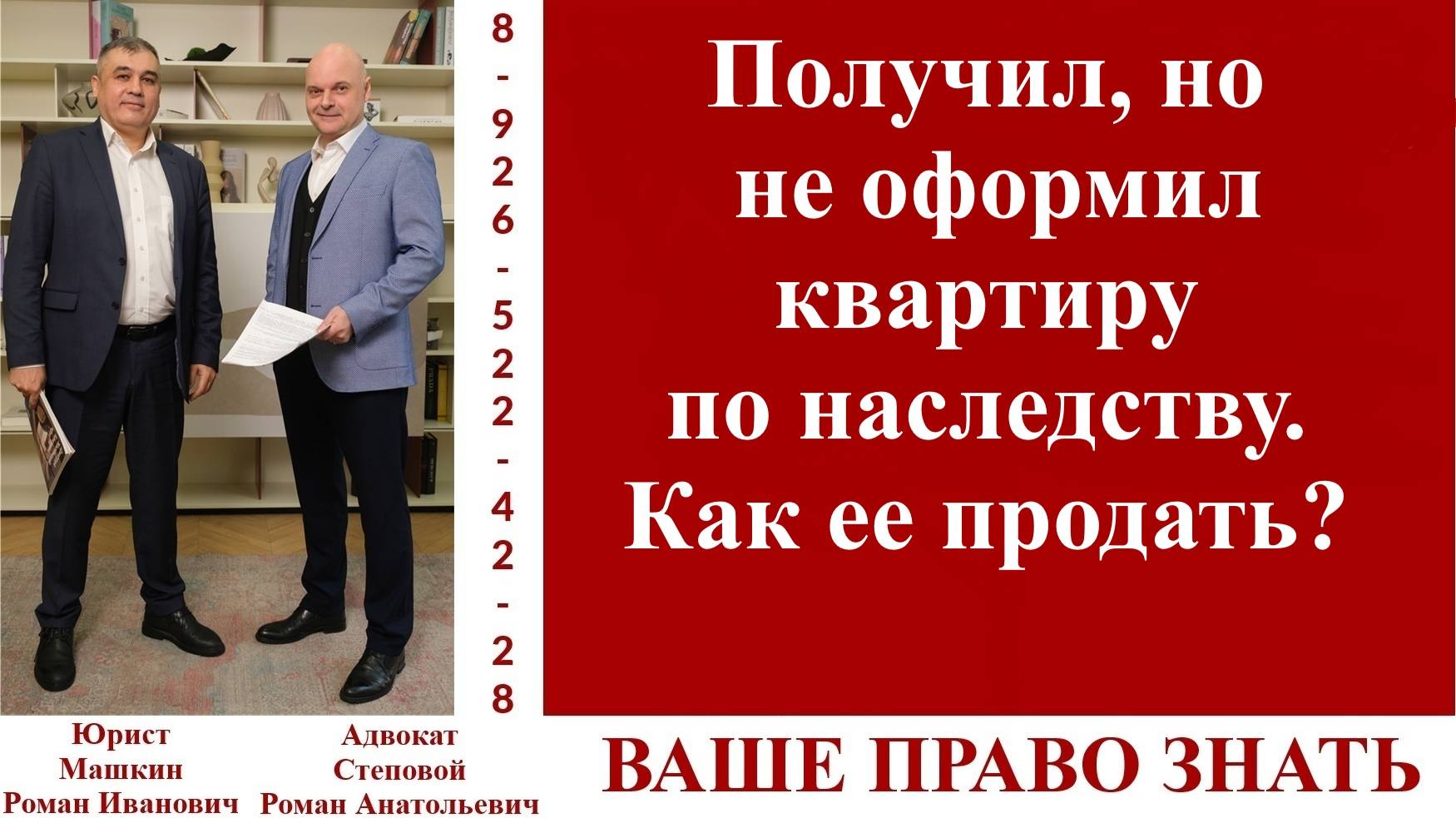 В ролике эксперт адвокат Роман Анатольевич Степовой отвечает на вопрос подписчиков. Телефон для консультаций +7-926-522-42-28 https://taplink.cc/md_rielt https://t.me/vashepravo_znat группа в Телеграмм для общения. Канал «Ваше право знать» создан для помощи гражданам в решении их юридических и не только вопросов. В форме кратких консультаций эксперты канала доступно рассказывают о возможных путях выхода из сложных правовых ситуаций. Основной целью канала является оказание аудитории юридических услуг и повышение правовой грамотности населения. Эксперты канала простым и понятным языком рассказывают о практической юриспруденции на конкретных примерах. Подписывайтесь на наш канал, обращайтесь с вопросами и за помощью. Мы найдем время для каждого. ЭКСПЕРТЫ: Машкин Роман Иванович, практикующий юрист со стажем 23 года, 2 Высших образования: Ставропольское ВАИУ (первые два года СВАУЛШ): штурманский факультет, Инженер по управлению воздушным движением. В 2000 году Военный Университет МО РФ, юрисконсультский факультет, юрист. Начальник юридической группы в МО РФ, Помощник начальника Управления по правовой работе-начальник правового управления в Управлении по использованию воздушного пространства РФ, генеральный директор и учредитель Юридической компании и Агентства Недвижимости «МД-Недвижимость», член совета директоров Холдинга «Моя Семья». Правовое сопровождение телевизионных проектов Дом-2, Суд Идет, Машина, Мама в Законе, международных телевизионных проектов. Являлся экспертом в телевизионных программах на телеканалах ТНТ, МИР, ТВЦ, участник круглых столов ТПП, Госдуме РФ, участник конференций, проводимых Минстроем России, член школы переговоров Игоря Рызова, состоит в деловом клубе Екатерины Уколовой. Правовое сопровождение компаний и ИП, представительство в Арбитражных судах и судах общей юрисдикции по вопросам налогового права, гражданского права, международного права. Банкротство юридических лиц. Семейное право. Сопровождение сделок с недвижимостью в РФ и за рубежом. Степовой Роман Анатольевич, адвокат, руководитель адвокатского кабинета. С 2002 года успешно осуществляет адвокатскую деятельность по представлению интересов и защите прав граждан и юридических лиц. С 2000 по 2019 года преподавал на юридическом факультете Московского государственного областного университета, (ныне Государственный университет просвещения), дисциплины гражданско-правового и государственно-правового профиля. Автор многочисленных публикаций по вопросам прикладной юриспруденции. В работе с клиентами придерживается принципов порядочности и профессионализма. В любой ситуации ищет оптимальную модель правового поведения и минимизирует потери клиента. Основную задачу видит в осуществлении реальной помощи доверителям и подзащитным. В общении с клиентами максимально честен. Майор юстиции запаса. Посаднева Светлана, ведущая, студентка старших курсов ВУЗа, эксперт трудового права. Телефон для консультаций +7-926-522-42-28 Смотрите нас где удобно https://t.me/vashe_pravo_znat Телеграмм канал проекта "Ваше право знать." https://t.me/vashepravo_znat группа в Телеграмм для общения. https://www.youtube.com/@VashePravoZnat канал Ваше право знать на Ютюб https://rutube.ru/channel/30527736/ канал Ваше право знать на Рутюб https://vk.com/public219361576 сообщество во Вконтакте https://www.youtube.com/@user-zt2rt7vh1m канал Ютюб адвоката Романа Степового https://md-rielt.ru/ сайт МД-Нед