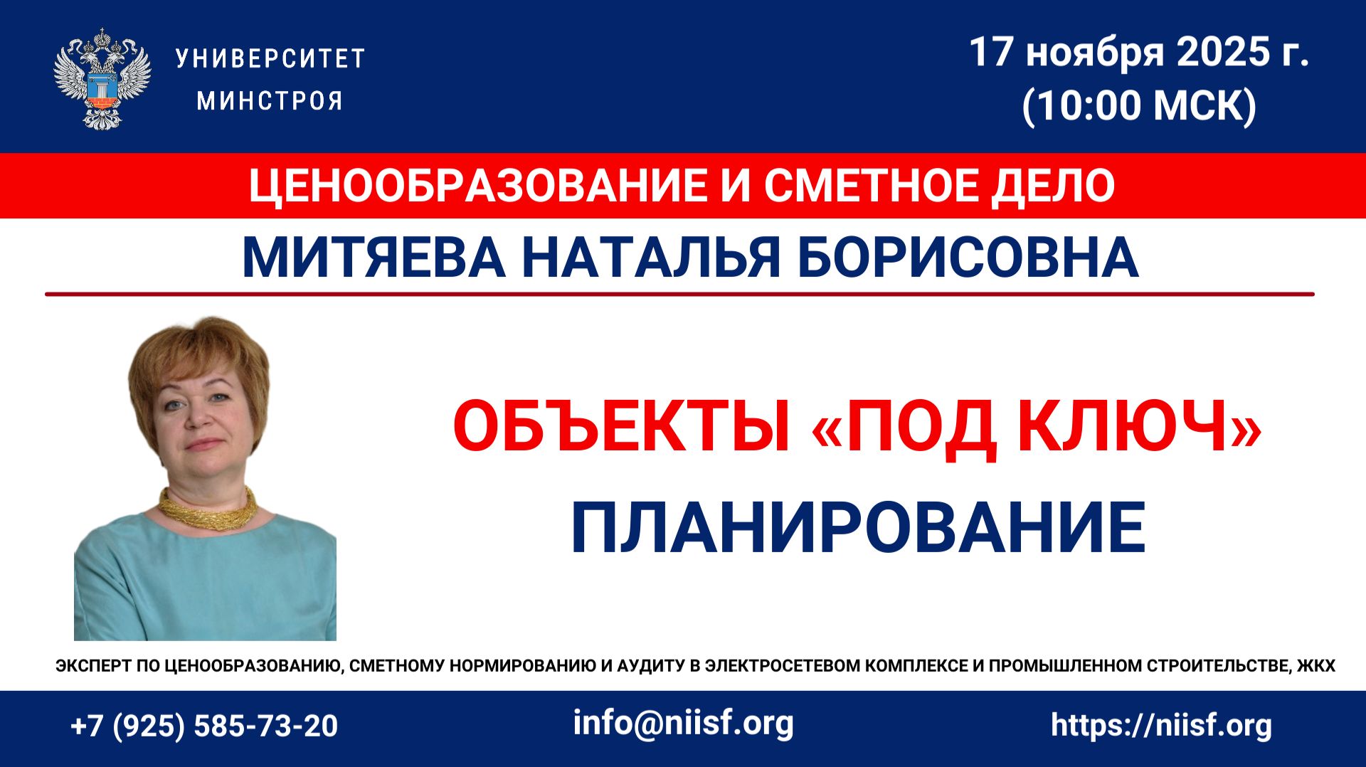 Видео данного вебинара открыто к просмотру временно, в рамках акции к новому году. Успейте посмотреть бесплатно! Вебинар. Планирование объектов «под ключ» Вебинар проводится в рамках экспресс-курса "Ценообразование в объектах под ключ: полный цикл реализации" Дата проведения: 17 ноября с 10:00 до 12:00 (по Мск) Трансляция вебинара в прямом эфире доступна для всех желающих, ссылки для подключения к трансляции за 15 минут до начала размещаются в группе Университета Минстроя Преподаватель курса/вебинара: Митяева Наталья Борисовна – эксперт Университета Минстроя НИИСФ РААСН (ценообразование, сметное нормирование и аудит). Независимый эксперт НО ТЦА. Специалист экспертной группы Комиссии по ценообразованию и ТЦА при Общественном Совете Минстроя РФ. Преподаватель кафедры «Экономика и управление в строительстве» ГУУ (г. Москва) В процессе вебинара рассмотрим вопросы: В современных условиях всё больше заказчиков отдают предпочтение формату реализации инвестиционных проектов с привлечением единого генерального подрядчика. На вебинаре мы подробно разберем ключевые аспекты планирования объектов «под ключ», включая методику расчета начальной максимальной цены контракта (НМЦК). Участники получат практические инструменты для эффективного планирования и управления проектами. Особенности планирования проектов «под ключ» Методики расчета НМЦК с использованием укрупненных нормативов Применение данных объектов-аналогов в планировании Учет фактической инфляции при планировании Прогнозная оценка стоимости проекта Практические рекомендации по оптимизации затрат