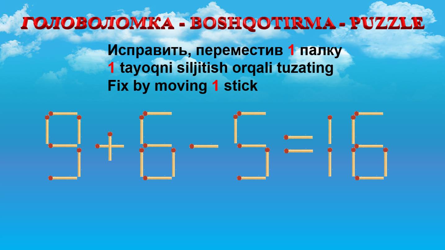 ГОЛОВОЛОМКА - BOSHQOTIRMA – PUZZLE. Спичка. 9+6-5=16, 5+2+5=10, 5-2+2=2, 8-2+5=10