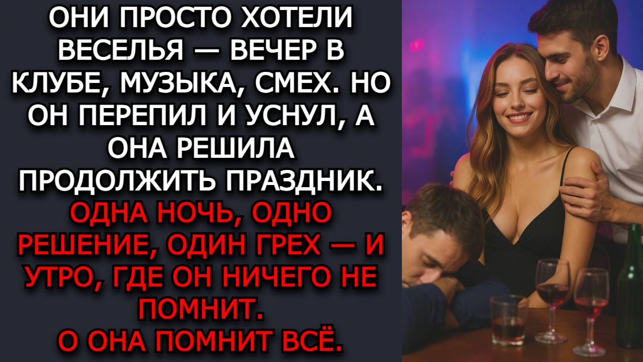Они давно не выбирались из дома. Решили просто повеселиться, как раньше — без забот, без разговоров о работе и усталости. Музыка, огни, алкоголь, улыбки — всё казалось лёгким и правильным. Но ночь пошла не так. Он перепил, уснул прямо за столом, а она осталась одна — красивая, обиженная, забытая. И тогда появился он — молодой официант, внимательный, слишком внимательный. Один коктейль, одно касание, одно решение, которое изменило всё. Когда всё закончилось, она просто разбудила мужа, вызвала такси и поехала домой. Там, среди привычных стен, она призналась ему. Он слушал, полусонный, не понимая смысла её слов. А утром проснулся — и ничего не помнил. Только она теперь живёт с этим — с ночью, которую никто, кроме неё, не хранит в памяти. Вы смотрите канал «Голос Истории». Подпишитесь, поставьте лайк и напишите в комментариях: если правда никому не нужна, стоит ли говорить её вслух? _________________________________________________ #голосистории #историяизжизни #жизненныеистории #драма #семья #предательство #измена #ночь #вина #тайна #прощение #клуб #официант #жена #мужижена #отношения #любовь #разочарование #реальныесудьбы #историинаночь #жестокаятайна