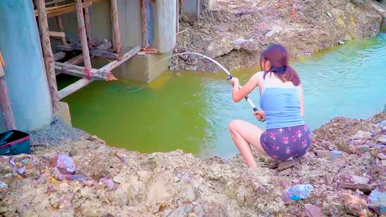 Девушка ловит рыбу у водостока Рыбалка удалась Поймала большого сома